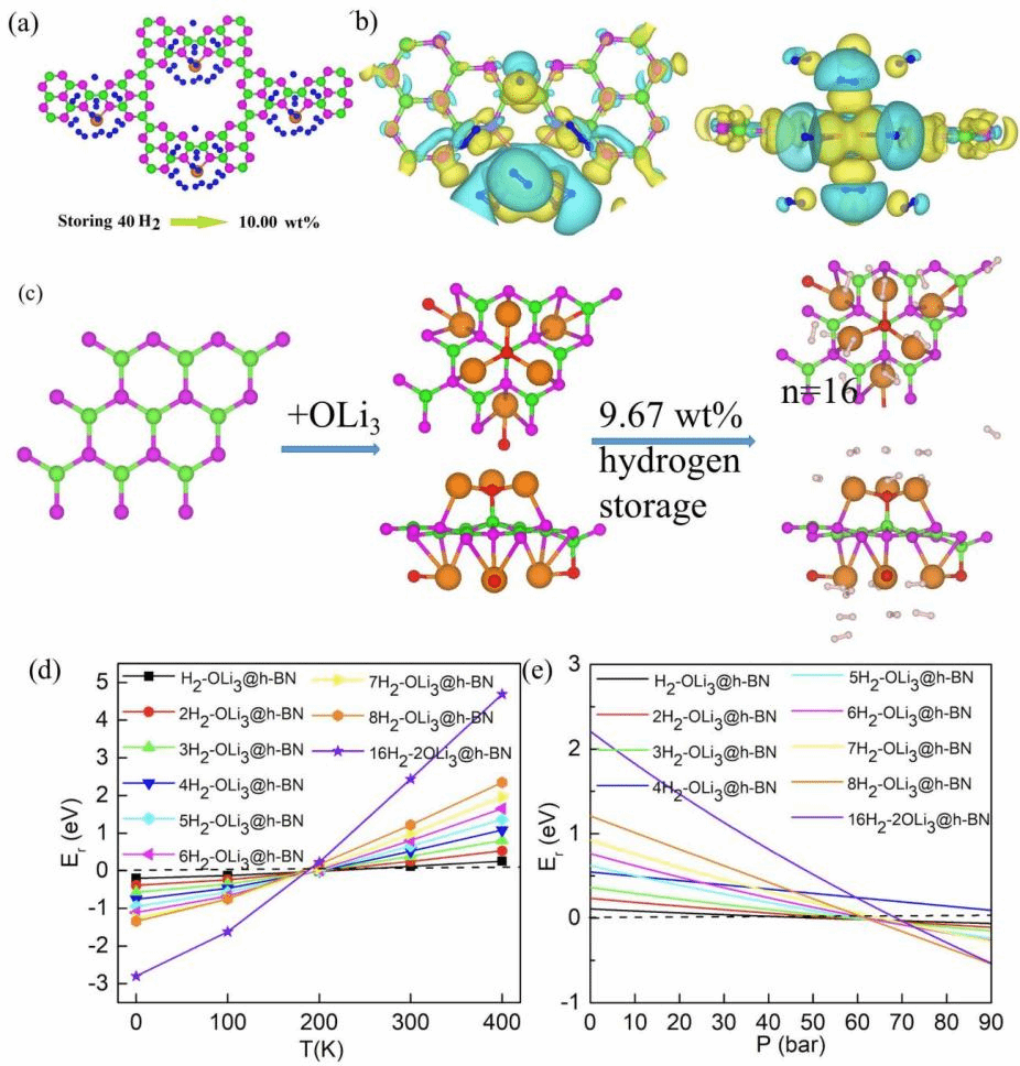 氢能是一种可持续的绿色能源,温和条件下储氢密度低是氢能发展的瓶颈之一,高容量、快速吸附、稳定易再生是储氢材料的发展目标。自石墨烯被发现之后,由于其优异的结构特征和电子性质,原子厚度的二维材料被广泛应用于储氢领域。张宁宁等人对具有纳米介孔的g-C6N7h-BN单层的储氢性能进行了理论研究。研究发现,纳米介孔的g-C6N7h-BN单层对氢分子的吸附能皆小于0.1 eV,并不具有良好的储氢性能,不能直接作为储氢材料。而Mg修饰的g-C6N7Mg@g-C6N7)单层可作为高容量的储氢材料,Mg@g-C6N7单层可吸附10H2且具有10 wt%的质量储氢容量;研究还发现,Mg2+ 与第1至第4H2分子中的H之间存在轨道相互作用和静电相互作用,而只有强静电相互作用使第5至第10H2分子结合到Mg2+阳离子上。同时,对超碱团簇OLi3修饰的单层六方氮化硼(OLi3@BN)的储氢性能的研究发现,O-B键足够强,使得超碱团簇OLi3锚定在单层h-BN衬底上;H原子与Li+之间的弱轨道相互作用和静电相互作用使得单层2(OLi3)@BN可吸附16H2分子,质量储氢量高达9.67 wt%;最后,研究了温度和压力对16H2-2(OLi3)@BN稳定性的影响,发现16H2-2(OLi3)@BN体系在室温、微压下稳定。两项研究结果表明,Mg@g-C6N7OLi3@h-BN单层皆是很有前途的储氢材料。