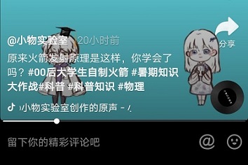 视频制作之前,小物科普志愿服务队在网络上查询了与火箭有关的专业知识,对其语言进行通俗化、卡通化,并将其编排为一部小情景剧视频,反复推敲语言。视频首先介绍了刘上同学所制作的固体火箭,通过简单的画图,将火箭的运行原理表现出来,图象简单易懂,符合小朋友们的认知能力,通过举例子:子弹的后坐力、滑冰推人时的相互滑动,将火箭运动定律——牛顿的第三运动定律清清楚楚的介绍给小朋友们。视频一经放出,评论区便展开了讨论,有的家长表示自己的孩子通过学习对火箭的原理已经较为了解,还有小朋友在评论区补充更多的相互作用力的例子。