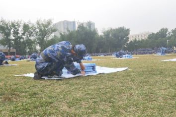 下午三点,物理学院新生已经到达北苑操场,在各助班、宿导的带领下列队等待,身背自带被具,为比赛做着准备。开幕式上楼管会负责人代表学校向新生致辞,希望新生能通过此次叠军被大赛加强对整理宿舍内务的重视,培养团队精神和集体荣誉感。随后,各学院间进行拉歌,他们精神饱满、士高气昂,展现出朝气蓬勃的精神面貌。翼虎军团的教官向同学们进行叠军被标准演示,讲解叠军被的具体要求,以及此次比赛的流程和奖项设置。